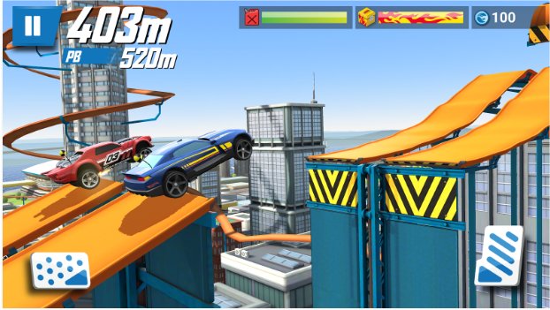 The game does its best to replicate the experience with pitfalls and challenges that make many of the tracks difficult. It's a bit of a grind to upgrade your vehicles, but you can take advantage of 2 gifts every 6 hours or so to get extra coins to buy upgrades. Watch a video and double those free coins. Like most games, you can purchase more coins to upgrade sooner. As you progress, and you've upgraded your cars, you will find you can't go back and select an already upgraded car because it's not good enough for the newest tracks so grinding a bit is forced. I think it's a tightrope, but they could loosen this up a bit. The camera angles, like many mobile games, are difficult to nail and while they get it, for the most part, there are some tracks you need to memorize or you will get stuck in some places. This could use some minor tweaking as well. For example, there are some tracks where you need to slow down to go up a small hill before it quickly levels off and goes up a large hill. If you didn't see the double hill coming, you'll have to roll backwards and try it again, or if you missed it completely, you might blow up your ride. Rolling backwards also puts you at risk of running out of fuel, which is offered at various spots along the track. Last I checked, Hot wheels didn't run on gas and the only excuse for needing gas is to make completely the tracks more difficult.