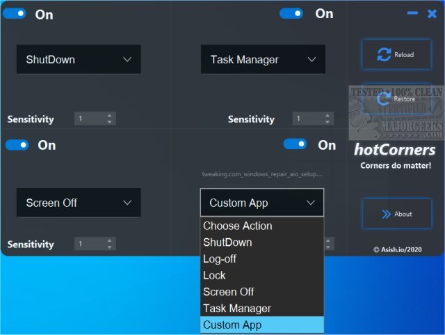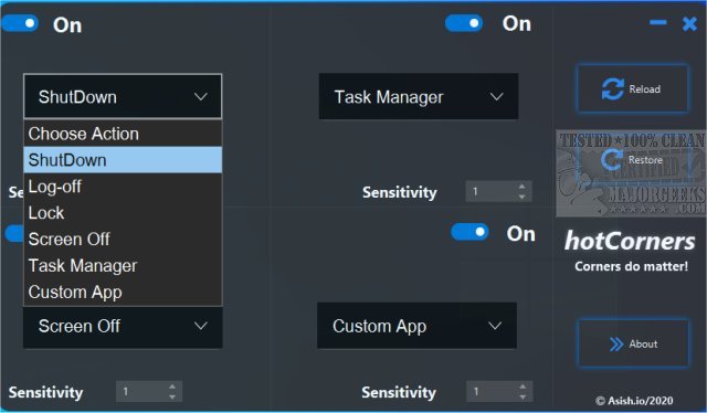 HotCorners gives you a way to trigger various events when you point your mouse cursor in any of the four corners of your screen. Some of the included actions are shut down, log-off, lock, turn the screen off, open Task Manager, or run custom applications. These events are automatically triggered when the mouse cursor moves into any of the corners. You can choose from a drop-down list of functions available, or you can set script files to trigger. Additionally, you can also set the sensitivity(reaction time) for the event to trigger.