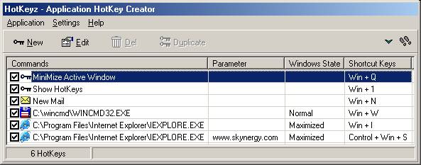 HOTKEYZ is a shortcut utility with shortcut control for executing other files, launch them in a Normal, Minimized or Maximized State. The Parameter option gives you parameter control when launching another application like Internet Explorer and surfing to a specific site as parameter. For example C:Program FilesInternet ExplorerIexplore.exe with the parameter www.skynergy.com. It also features launching your e-mail window when composing a new e-mail even if your e-mail program is not active or not focused.