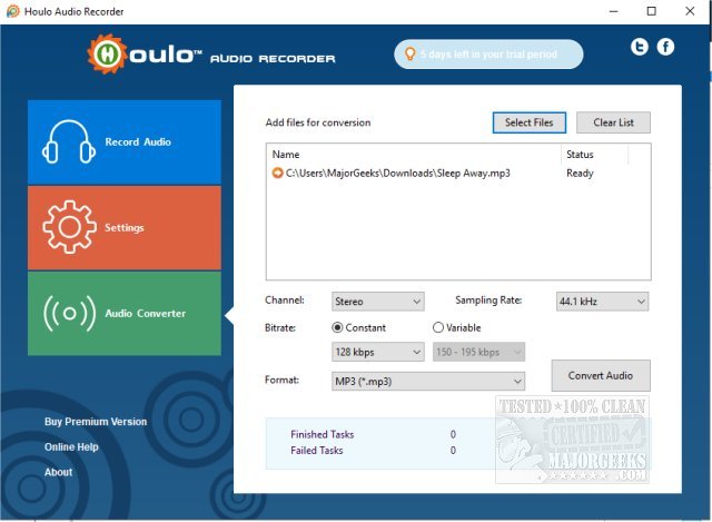 Houlo Audio Recorder can also perform scheduled recordings to record vocals automatically, business meetings, interviews, conferences, podcasts, narrations as well as record and produce your song in your DIY home studio, with little more than a computer, microphone, and some headphones. You will also be able to capture audio from CD/DVD player, AM/FM radio, AUX input device, as well as digitize your cassette/vinyl collections. One cool feature is the ability to extract audio from video files and convert the audio files to a variety of formats like AAC, MP3, OGG, FLAC, WAV, and WMA.