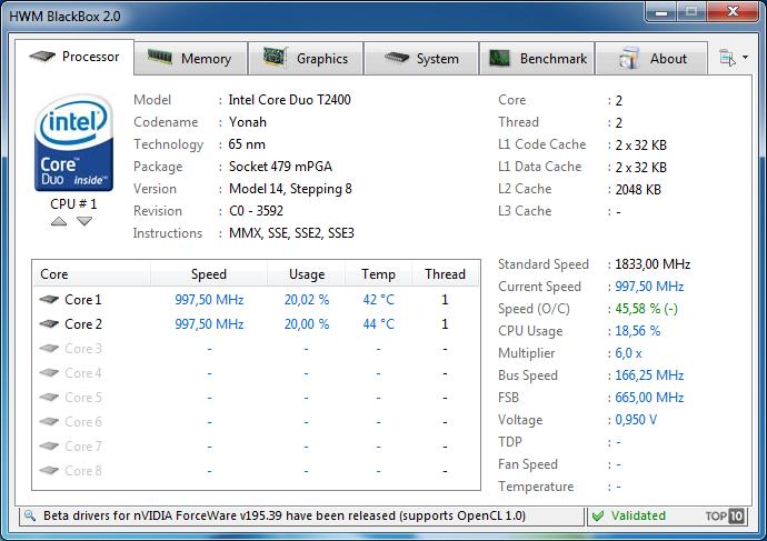 HWM BlackBox Processor ID interface displays processor-specific information such as manufacturer, model, socket type, version, revision, code name, supported instruction sets, number of cores, process technology, maximum speed, overclocking rate, multiplier, L1-L2-L3 cache capacities, current speed and temperature values and usage, even the official logo of your central processor with utmost accuracy.