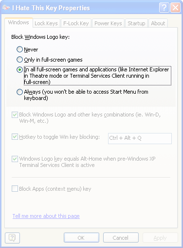 I Hate This Key can customize any system-wide keys on any keyboard. This means deactivating a key completely (a very popular option for Caps Lock), customizing them (for example, activating Caps Lock only when pressed twice or held down), F-Lock inversion option for the functional keys (F1 through F12), forbidding deactivating of Num Lock or any other key, and allowing game users to block infamous Windows Logo key along with system-wide key combinations (like Win+D) while playing games.