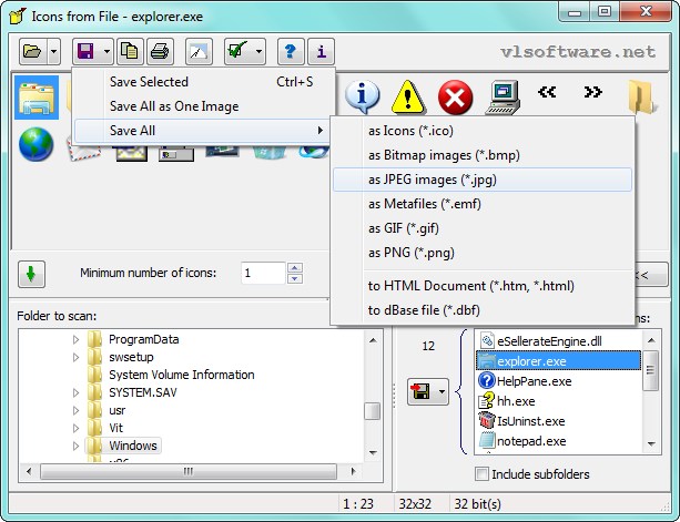 All or selected icon to ICO, BMP, JPEG, GIF, PNG, or EMF files;