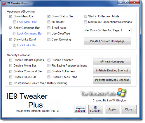 Our IE9 Tweaker originally allowed you to tweak a few settings in IE9 RC. Our Home Page Maker allows you you to customize your Internet Explorer, Firefox, Chrome & Opera browser home page. Now combining the best tweaks of these two apps – and more – we have now developed and released a new freeware IE9 Tweaker Plus.