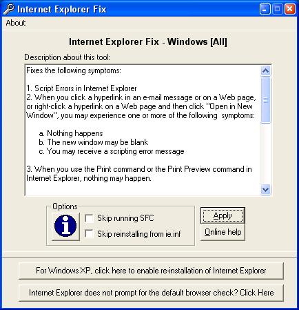 Internet Explorer Fix - is a general purpose repair utility for Internet Explorer which repairs Internet Explorer by registering it's core DLL files and through the INF file. Additionally if it detects Windows 2000/XP as the Operating System, it runs SFC to restore missing or corrupt Windows system files. Fixing the COM registration helps in many cases. More Information is given below.
