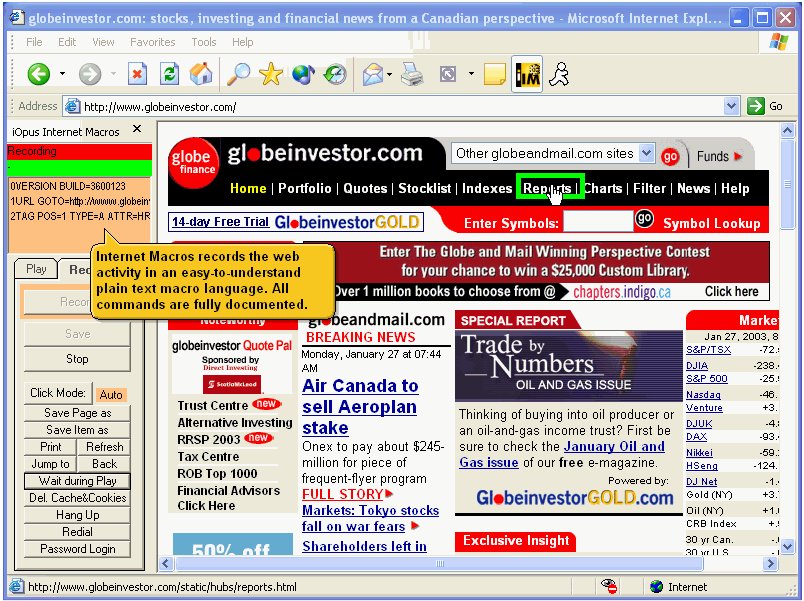 Any combination of browsing, form filling, clicking and information gathering can be recorded into a macro and the iMacros software assists you during the recording with visual feedback.