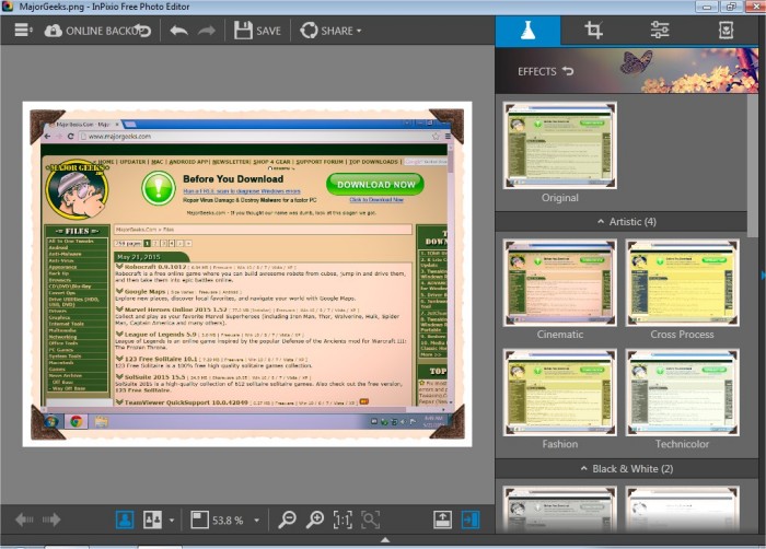 Intuitive Interface For Beginners - The free photo editor download by InPixio is the easiest way to turn all your pictures into a professional looking photo album that you will be proud to share with family and friends. The free download version is only 15MB and has been specifically designed as a user-friendly product with easy to understand instructions.