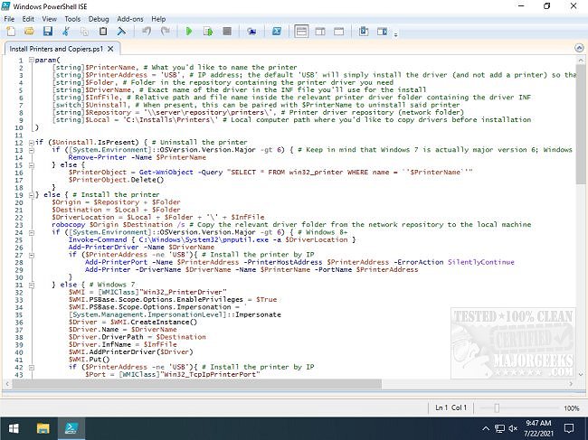 Install Printers and Copiers is a tiny script that installs printers and copiers entirely through Powershell.