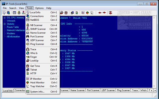 IP-Tools contains a number of useful options that provide various features for examining and monitoring network connections. It includes a Local Info feature that displays information about the local host, such as processor, memory, and Winsock data. There is a Connection Monitor feature that shows information about current TCP and UDP network connections. NetBIOS Info can be used to obtain NetBIOS information about network interfaces of local and remote computers, while NB Scanner is a shared resources scanner. There is also an SNMP Scanner that scans network(s) for SNMP-enabled devices, while the Name Scanner scans all hostnames within a range of IP addresses. It has a Port Scanner feature that scans network(s) for active TCP-based services, and the UDP Scanner scans network(s) for active UDP-based services. You also get a Ping Scanner that pings remote hosts over the network, while Trace traces the route to a remote host over the network as well as WhoIs which obtains information about an Internet host or domain name from the NIC (Network Information Center), Finger retrieves information about the user from a remote host, and LookUp looks for domain names according to its IP address or an IP address from its domain name.