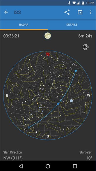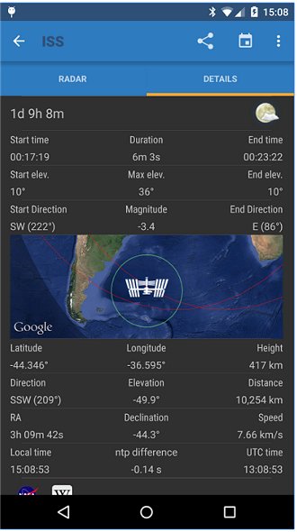 It will notify you when and where to look for the International Space Station or Iridium flares. ISS Detector Satellite Tracker will produce an alarm a few minutes before a pass, so you have ample time to get ready. This app will ensure you never miss a pass of the ISS or the bright flashes of the iridium communication satellites.
