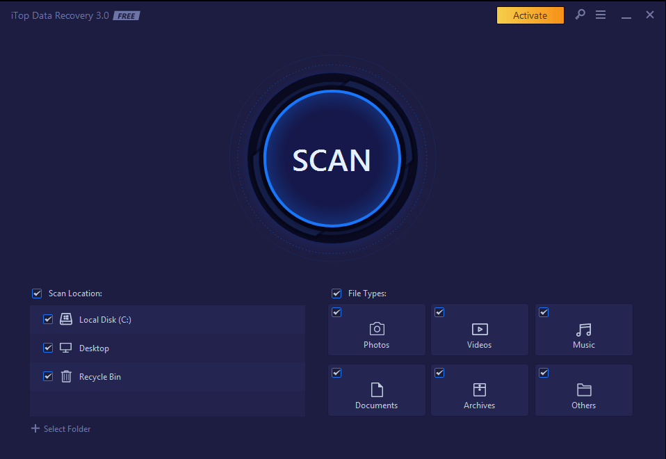 iTop Data Recovery makes the recovery process so simple that you only need a few clicks. Select file locations and file types, click the SCAN button, and recoverable data information will show up. Before the scan, you can select special file types and