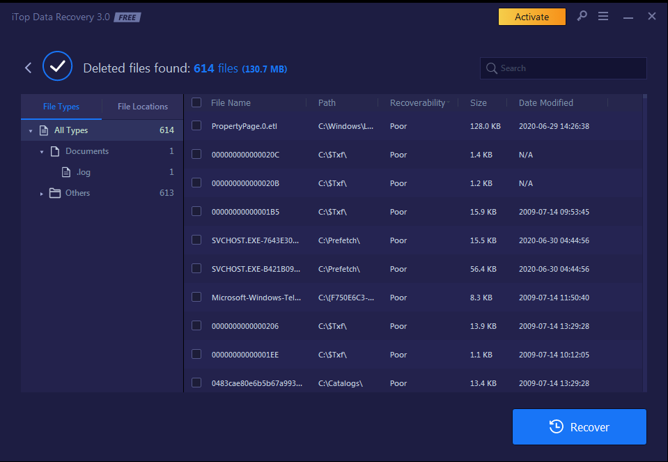 locations or select all file types and locations. After a thorough scan, iTop Data Recovery will display the basic information like file name, original location, and size, evaluation of the recoverability for each file, and a preview of the data before recovery. Then you can select the data you want and click the Recover button.