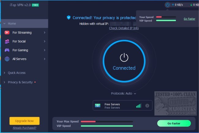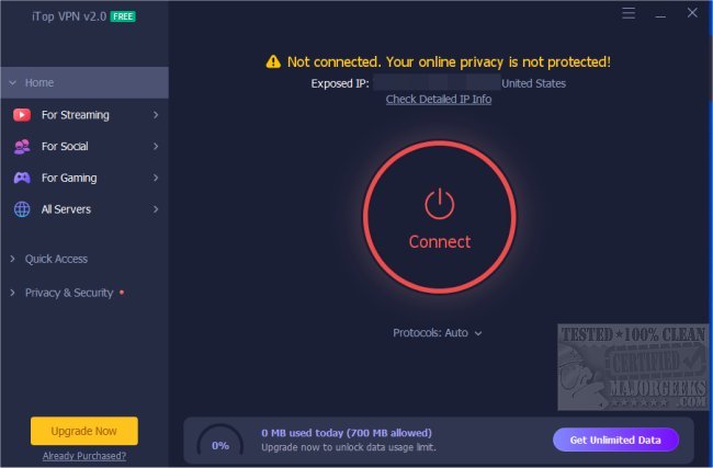 iTop VPN gives you a streamlined process so you can hide your IP and encrypt your network data, ensuring that bad actors do not intercept your location, identity, and activities. The iTop VPN automatic Kill Switch acts as your guard net when the VPN connection shuts down. You'll never worry about exposing your information and sensitive data.