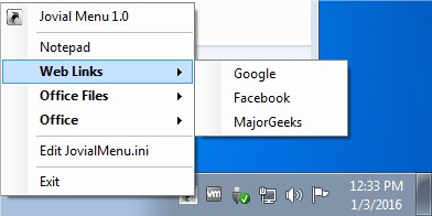 Jovial Menu resides on the System Tray and will bring up the menu upon single-clicking or double-clicking on the program icon.