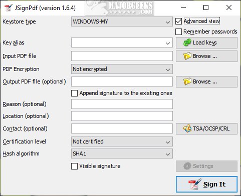 You can choose from key alias, input PDF file, PDF encryption, certification level, hash algorithm, and more.