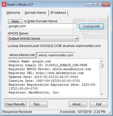 Karen's WhoIs is displayed from a simple interface that allows efficient utilization without unneeded clutter. You can look up either by domain or IP address both of which includes a drop-down menu for server selection.