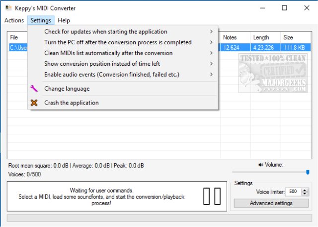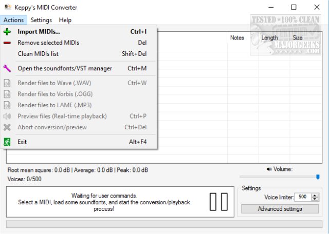 You can go to "Action," "Import." or darg-and-drop your MIDI files directly into the application. Information on each MIDI is provided, including Notes, Length, Size, and more. Settings allow you to make numerous changes, if you desire, before converting to WAV. Some of these settings are Volume, Voice Limiter, and more. Advanced settings available include Audio Frequency, disable audio effects, force constant bitrate, and more.