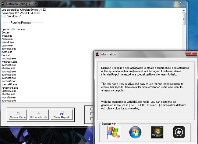 Killtrojan Syslog is a free application to create a report about characteristics of the system to further analyze and look for signs of malware, also is intended to put the report in a specialized forum for users to help.
