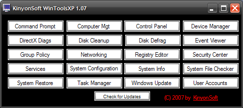 WinToolsXP is a freeware application that provides quick and easy access to Windows XP's built-in system utilities such as Command Prompt, Device Manager, Disk Cleanup, Registry Editor, User Accounts, and more - from one convenient spot.
