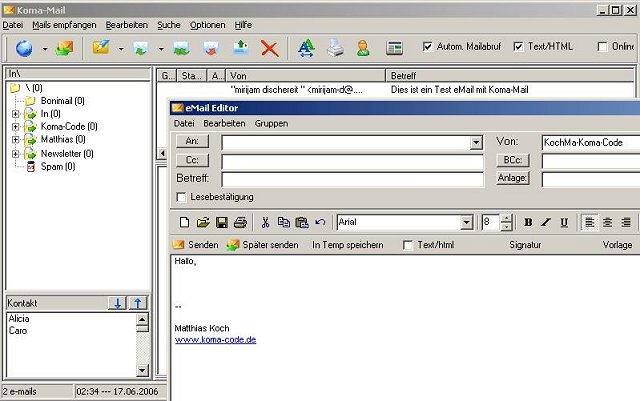 Koma-Mail is an email client which is comfortable and has very handy functions. Koma-Mail does not need an installation and your accounts can very easily be recreated through a backup. So, in contrast to other email clients, you do not have to make your settings all over again in case you lose all you data.