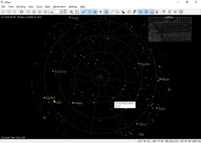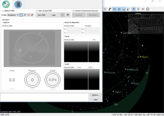 You are walked through some basic steps on the first run, including your location. Smaller towns aren't listed, so you might need to pick a larger city nearby. For example, we tested it from Liverpool, NY, and had to use Syracuse, NY. Once this is done, you can download optional data files to enhance KStars, including Messier object images or a complete NGC/IC catalog. These should help with performance.