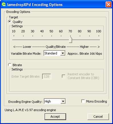 LameDropXPd is a practical frontend for LAME encoding engine that makes things easier to the user, as there is no need to know about command line usage: most LAME settings are reachable on a graphical interface. Besides encoding WAV files to MP3, it can transcode Ogg Vorbis files, decode MP3 files to WAV, and auto-tag the files it encodes.