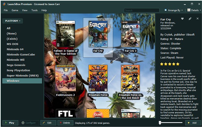 LaunchBox supports arranging and filtering by genre, platform, ESRB rating, developer, and publisher, and even has custom status and source fields to use to classify your games however you choose. The interface is straightforward to use and powerful all at the same time. You can also automatically download box-art for your games, but it will also grab beautiful fanart, screenshots, logos, and more, creating a surprisingly immersive experience. Fanart and other images can be used as LaunchBox’s background as you browse your games, creating an engaging, fun experience.
