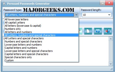 LeeLu Personal Passwords Generator will create passwords up to 10 characters long that can include lower/upper case, numbers, special characters as well as user defined custom selections. Once you have created a unique password you can encrypt it for an added layer of security and then save that document. If you are overly paranoid, you can always use EncryptThat to further secure the created password data.