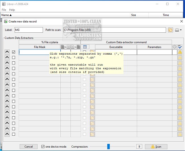 librer's primary function is to help users catalog their files, particularly those stored on removable media like memory cards and portable drives. With it, users can add metadata, called custom data within librer, to their files and later search the records using multiple criteria. Custom data can include any text-based information obtained through user-selected commands or scripts as long as it meets the user's requirements and is limited only by the available memory and software accessible for data retrieval. The retrieved data is then stored in a new database record and can be used for search or verification purposes.