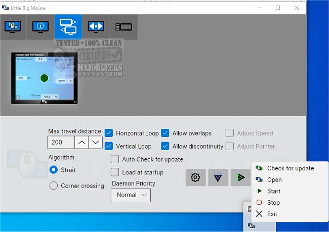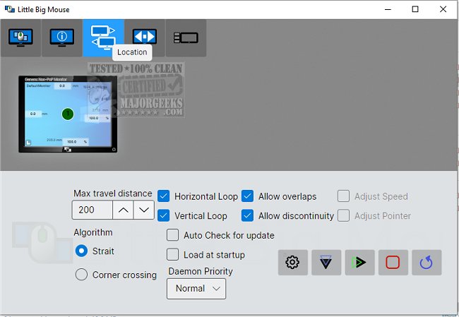 In the bottom panel, you can enable or disable Little Big Mouse's functionality. You can also activate a horizontal or vertical loop to make your mouse return to the second screen when it exits the first one. The application also allows you to disable screen edge snapping to leave gaps between your screens. Little Big Mouse provides Tooltips for most of the buttons, so if you get stuck, you can hover your mouse cursor over a button to see a brief explanation.