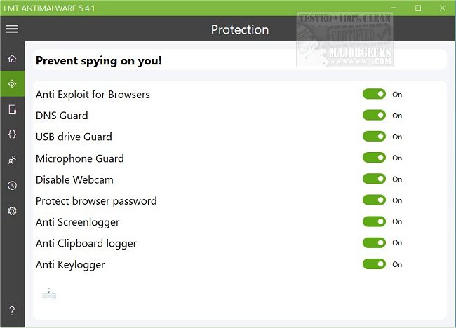 LMT AntiMalware uses real-time protection to prevent viruses, trojans, keyloggers, block keyloggers, screen loggers, clipboard loggers, and webcam loggers. It also includes a password manager and a registry guard. LMT Anti Logger will also permit you to configure Windows Security and provide you with a secure online shopping and payments avenue.