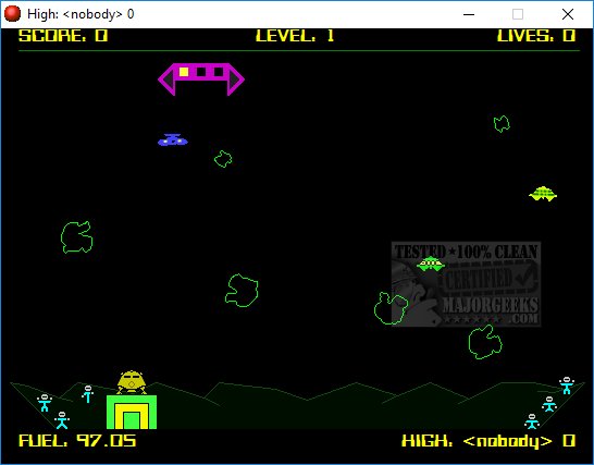 Like many of his remakes, the game is accurate but has different graphics and colors. You release your ship from the mothership and try to land and save the stranded astronauts. There are three landing pads and six astronauts to save. You need to avoid spaceships and asteroids.