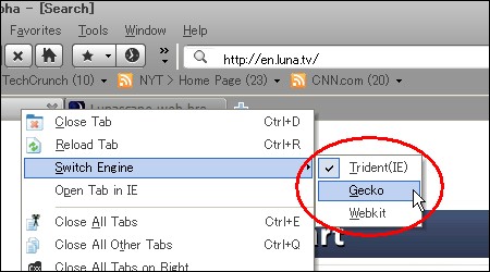 By clicking the smart engine-switch button next to the address bar, it is very simple to switch rendering engine for any page, until you find the engine most suitable for displaying the page contents. Sites designed exclusively for Trident (e.g., bank sites) can be registered in the Auto-Engine-Switch list, so that even if the default engine is Gecko, opening the Trident page automatically switches the rendering engine for that tab to Trident.