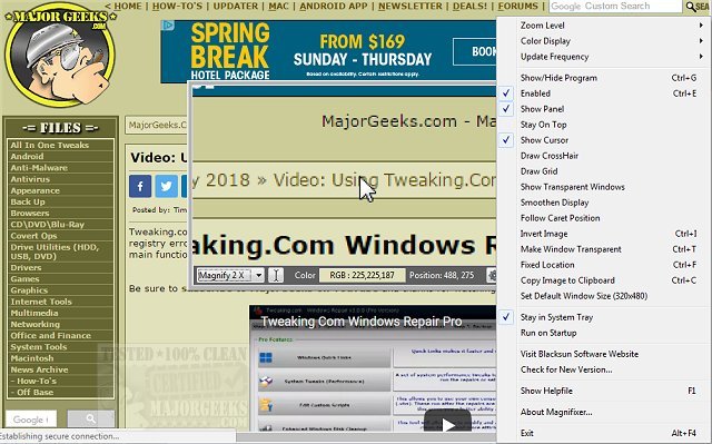 You can direct Magnifixer to anywhere on your screen and select the zoom level that suits the situation. It will magnify the area that your mouse cursor is pointing to with up to 40x magnification to ease eye strain. You can also invert the image, follow caret position, make the window transparent, copy the magnified image to the clipboard, add crosshairs, color display (HTML or RGB mode), and more.