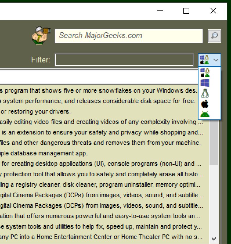 The Update function sits in your systray (next to your clock) and can notify you of any new files or articles on MajorGeeks.com without searching the site. Click the icon when you are ready to see new topics. If you want updates, hit the refresh button or set monitoring to automatic. The tabbed interface will show multiple days' worth of news. You can easily see whether the program is Windows, Linux, Mac, Android or all, or set up a filter to only see the types of software you are interested in. The layout is designed to be able to glance at titles and descriptions quickly, or you can filter and sort as needed.