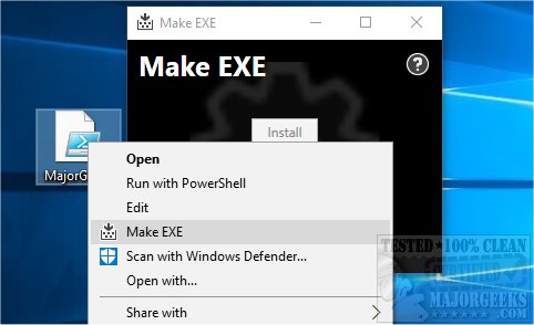 Simply click on install, and you should be able to find "Make Exe" when you right-click on any Powershell or batch scripts. We tested on other files and Make EXE worked perfectly by not appearing. After you click on Make EXE, you have a handful of options. The first one is embed files. This is important if you have multiple files to package. All you need is to have the files you want to be packaged in the same folder and tick the box next to Embed Files. You can also set an icon for your executable by placing creating a folder or placing an ICO file in the folder you're working with.