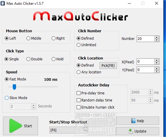 Max Auto Clicker's UI is user-friendly by making setting it up a breeze with no hidden menus or complex configurations. It is all upfront. It gives you a choice to set the mouse button for the left, right, or middle-click. It also includes the ability to set the specific click type from single click or double-click with the option to determine the speed between clicks in milliseconds.