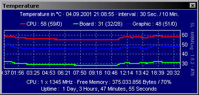 MBMLog logs the values of the temperature, fan and voltage sensors of Motherboard Monitor(MBM) and shows them in several diagrams. A running MBM5 is necessary.