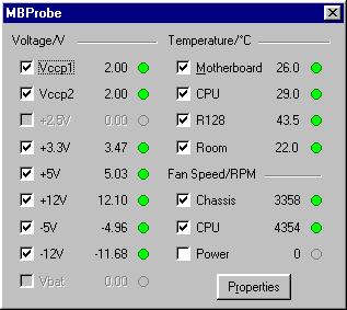 MBProbe is a program which monitors voltages, temperatures and fan speeds using hardware monitoring chip(s) available on many modern motherboards.