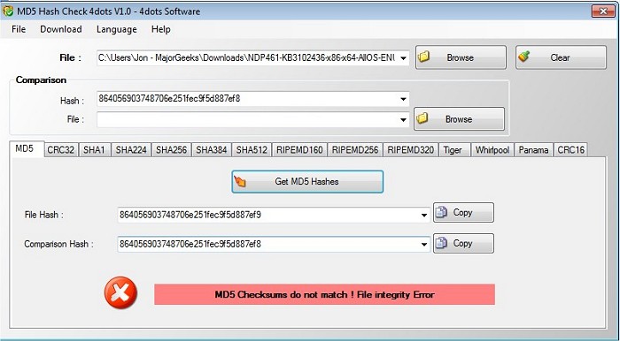 The MD5 Hash Check 4dots MD5 Checksum Validator can also be used as an SHA1 generator and it supports all the major algorithms including MD5, SHA1/256/384/512, RIPEMD160/256/320, Whirlpool, Tiger, Panama, CRC32, and CRC16.