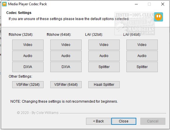 Media Player Codec Pack supports almost every compression and file type used by modern video and audio files.