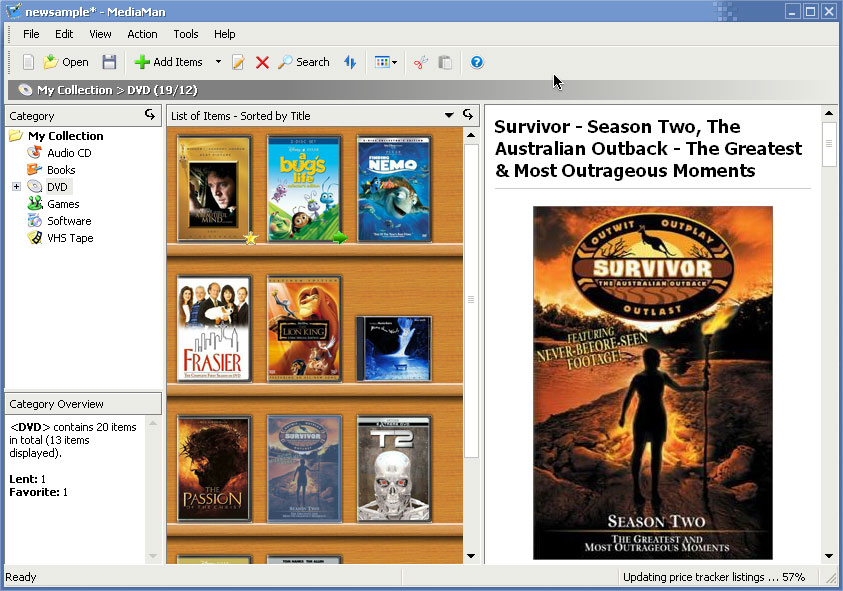 MediaMan is an organizer software designed to catalog your collection of music, books, videos, and games. It features virtual-shelf visual rendering of items, automated content retrieval, webcam barcode scanning, nested categories, tags, and flags for rental management. It's designed for you to organize the collection easily and quickly. Features such as single-click importing, drag & drop tagging, in-place editing can be really useful and time saving when establishing your own collection. MediaMan is also capable of playing back music and video files with the file association setup.
