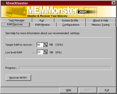 MemMonster is a special utility designed to help you solve the problems of Windows (ME/98/95/NT/2000/XP) memory management. Using easy to use interface you quickly and safely monitor and increase the amount of available physical memory. Several of its features: automatically or manually recover RAM, RAM defragmenter, memory tuning, customizable memory monitor.