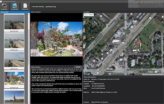 Picture, date, time, and location work together to paint an integral part of the story. In addition, memory Pictures Viewer includes the ability to embed your notes with your photos, so everything is nicely packaged together for a complete memory of that captured moment. Memory Pictures Viewer can be used with any JPEG photos but works best with those which include GPS and notes.