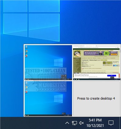 Read email on one, browse the web on the second, and do work in your productivity software on the third, without the clutter of the windows you're not using. After you configure hotkeys for switching desktops, you can create and switch desktops either by clicking on the tray icon to open a desktop preview and switching window or by using the hotkeys.