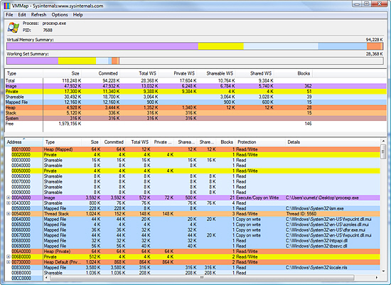 It shows a breakdown of a process's committed virtual memory types and the amount of physical memory (working set) assigned by the operating system to those types. Besides graphical representations of memory usage, VMMap also shows summary information and a detailed memory map. Powerful filtering and refresh capabilities allow you to identify the sources of process memory usage and application features' memory cost.