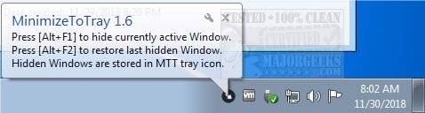Operation of MinimizeToTry is super simple, Alt + F1 will hide the currently active window, and then Alt + F2 will restore it. All the active windows you hide are stored down in the systray, but if the window you wish to hide requires elevated privileges, you must run the app as administrator. Also, if you have multiple windows hidden/minimized and want to bring them all back up at the same time, you can hit F10.