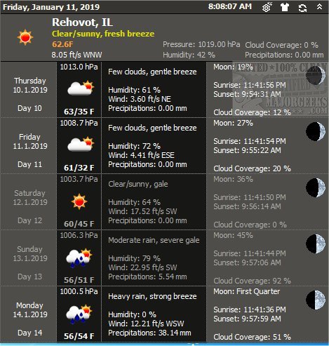 MiTeC Weather Agent is a free app that enables you to view your local 5-day forecast, and it also includes moon phases as well as sunrise/sunset times for your region.