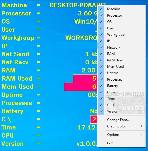 monitorApp will display details about your processor, operating system, IP address, total RAM & the percentage used, system uptime, and more. It is configurable, allowing you to add or subtract items from the display as you wish. You can also change the display's color, font type/size, and whether it is locked in place or moveable. It includes a right-click menu (you need to click on one of the line items) that provides you with your choices as well as the options menu for placement, etc. Additionally, if you double-click on one of the graphed items, like C:\, it will open the directory in Windows Explorer or for CPU, which will open up the Task Manager.