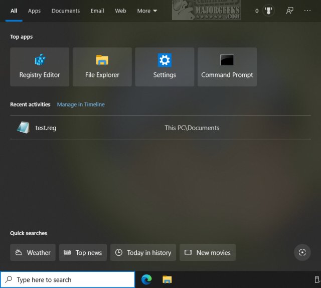 Move the Windows 10 Search Box to the Top or Bottom contains two batch files to move the Windows Search (Windows Key + S) to the top or bottom of the search screen.